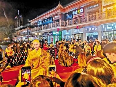 當(dāng)晚7時許,途經(jīng)表演現(xiàn)場的人流從四面八方聚攏于此,人們頻頻舉起手機將鏡頭對向眼前裙袂飛揚、舞姿優(yōu)美的“大地灣女神”和頷首微笑、靜若處子的“東方微笑”,一時間,閃光燈忽明忽暗此起彼伏,行人你來我往人聲鼎沸,步行街頃刻間歡聲笑語、熱鬧非凡。記者發(fā)現(xiàn),扮作“不倒翁”的“女神”模仿大地灣出土的人頭瓶外部特征,而一旁采用懸浮藝術(shù)呈現(xiàn)的“小沙彌”,打禪靜坐、頷首微笑。