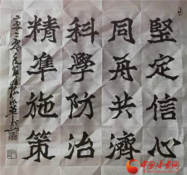 中國甘肅網(wǎng)2月12日訊(本網(wǎng)記者 張?zhí)m琴 張玉芳)2020年新春,面對(duì)突如其來的新冠肺炎疫情,全國人民正在以必勝的信心全力打贏這場沒有硝煙的戰(zhàn)爭。翰墨傳情,為抗疫助力。2月11日,由甘肅省文聯(lián)主辦,甘肅省文聯(lián)所屬文藝家協(xié)會(huì)、中國甘肅網(wǎng)承辦的甘肅文藝界戰(zhàn)“疫”主題作品展播活動(dòng)正式啟動(dòng)。我省12位書法大家揮毫潑墨,這些作品為所有奮戰(zhàn)在抗疫一線和防控疫情工作的平凡天使加油鼓勁,祈禱祝福,用文藝凝聚起抗擊疫情的強(qiáng)大精神力量,為我省防控疫情宣傳助力,受到了社會(huì)各界的贊譽(yù)。