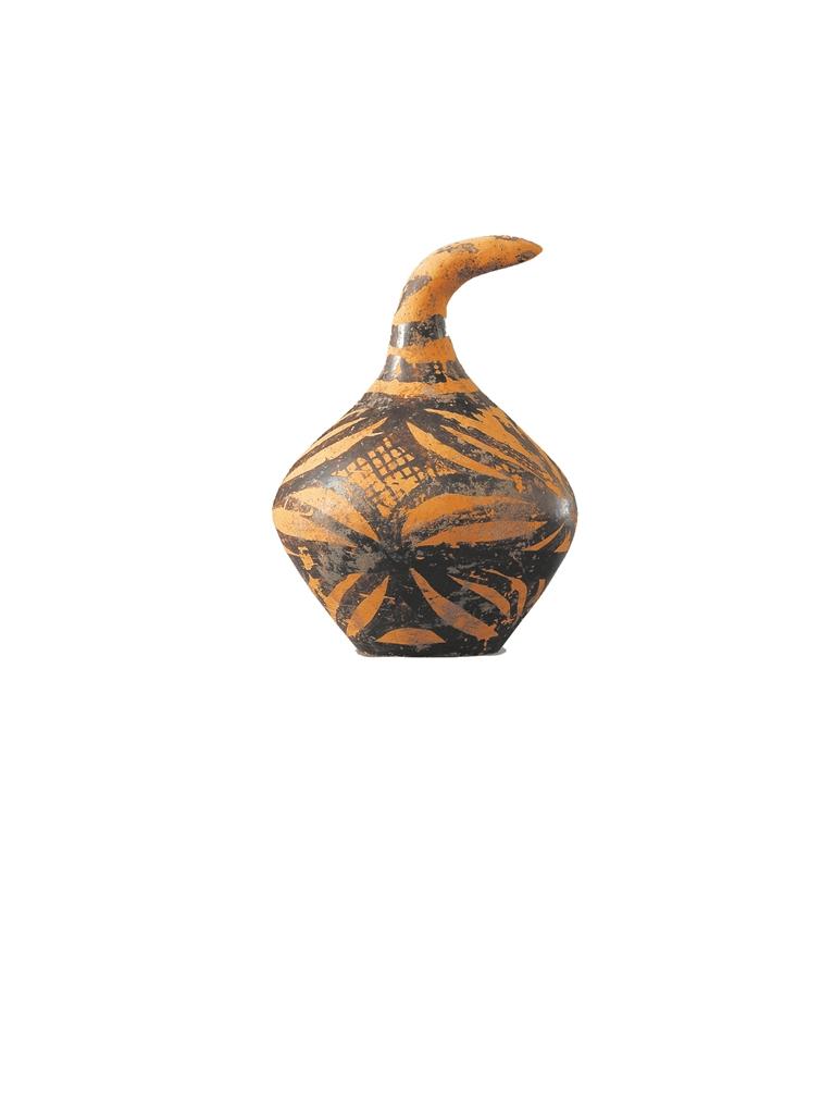 菱形網(wǎng)紋曲柄彩陶鈴 馬家窯文化馬家窯類型(距今約4800年),廣河縣祁家集出土。這件陶器看起來很奇特吧,若不是器身略鼓的腹部,幾乎就是歪嘴葫蘆的形狀。這件陶器腹部是中空的,里面裝著些小陶丸或小石子,搖晃起來沙沙作響。這件彩陶是干什么用的呢?其性能類似現(xiàn)在給幼兒玩的鈴鐺,它應該是原始的樂器。