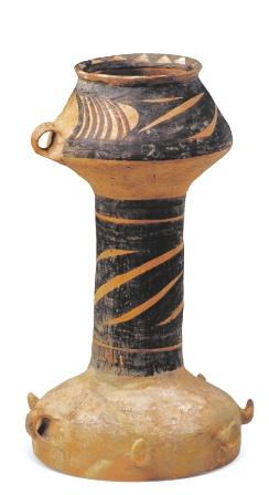 弦紋彩陶鼓 馬家窯文化馬家窯類型(距今約4800年),永登縣出土。這是一只陶鼓,鼓的兩端各有一耳,用于系繩,一端為喇叭口,另一端為罐形口,喇叭口外有六個爪突,用于固定鼓面。想必是用緊繃的獸皮做鼓面,這應是腰鼓的雛形,是迄今為止發(fā)現(xiàn)時代最早的打擊樂器。