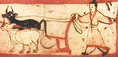此后,在酒泉丁家閘十六國(guó)墓壁畫中就只有一牛牽引的雙轅犁了。說明魏晉時(shí)期是中國(guó)從二牛單轅犁過渡到一牛挽拉雙轅犁的時(shí)代,這一過渡的狀況及特點(diǎn)出現(xiàn)在嘉峪關(guān)地主墓葬壁畫中,又說明甘肅是這一重大農(nóng)技改革的地區(qū)之一。