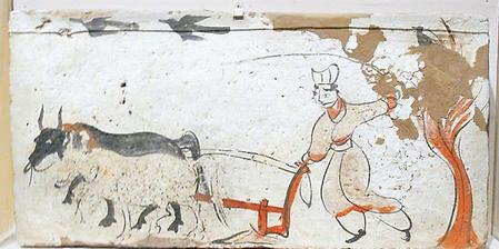 二是采用先進(jìn)的生產(chǎn)工具。在戰(zhàn)亂分裂的社會(huì)下,誰有充足的糧食,保證勞動(dòng)者起碼的生產(chǎn)、生活條件,誰就能收容更多的流亡者為家兵和佃客,提升經(jīng)濟(jì)、軍事實(shí)力。私家地主除大量地收容佃客外,還有能力采用先進(jìn)的生產(chǎn)工具和栽培技術(shù)。嘉峪關(guān)魏晉墓壁畫中所見犁鏵的改進(jìn),就能夠證明這一點(diǎn)。在多幅犁地的壁畫中,有二牛挽一犁的,也有一牛挽一犁的畫像。所拉犁鏵構(gòu)造有三種:時(shí)代較早的一號(hào)墓《耕播圖》仍為二牛抬杠的單轅犁,犁鏵扁平,犁箭中腰有一橫木,這種犁還較笨重,犁鏵破土也不深,與兩漢時(shí)期的差不多;時(shí)代稍晚的五號(hào)墓所畫耕犁,也用二牛挽拉,犁鏵系全鐵制成,前端呈等腰三角形,后部稍高于犁冠。犁箭固定在犁轅和犁床間,不能調(diào)節(jié),只是用來支撐犁轅和犁床,這種犁同樣不能調(diào)節(jié)耕地的深淺,但因犁鏵后脊稍高,因而破土較深;時(shí)代較晚六號(hào)墓的《牛耕圖》,耕犁有較大改進(jìn),它用一牛挽拉,犁鏵雖同是前端呈銳角三角形,但變?yōu)樘阻F鏵冠,犁鏵脊部隆起,前低后高。犁床由犁梢近底處斜出,前端安裝鐵犁鏵,犁鏵后部橫裝一塊長(zhǎng)方形木板,這是以往所未見的新式裝置。嘉峪關(guān)魏晉墓壁畫中所見犁鏵和漢代畫像石寬扁的犁鏵相比,具有狹窄、輕型化特點(diǎn)。六號(hào)墓挽牛還用曲軛,這種曲軛“用控牛項(xiàng),軛乃穩(wěn)順。”(元·王楨《農(nóng)書》卷)曲軛兩頭和犁的木質(zhì)雙轅前端連接,雙轅在牛后相合如單轅,再與犁梢相接。雖然還不如使用耕索輕便靈巧,但比漢代的肩軛單轅犁輕巧多了。