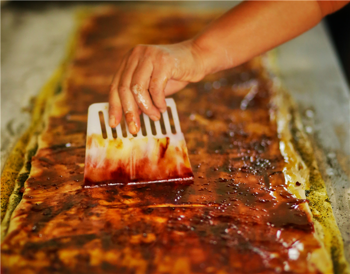再加上紅曲、姜黃、苦豆均勻涂抹到面餅上。