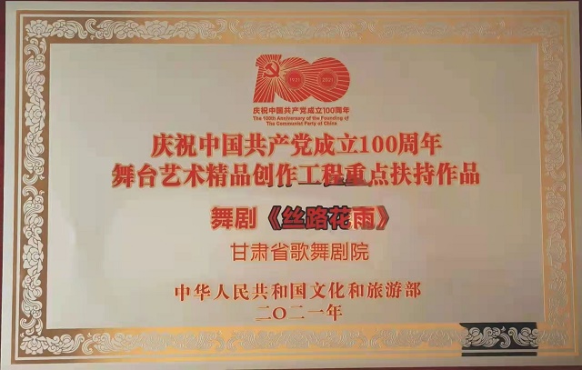 中國甘肅網(wǎng)12月19日訊 12月18日,文化和旅游部在山東省青島市召開的“2021年全國藝術(shù)創(chuàng)作工作會(huì)議”上,發(fā)布了“慶祝中國共產(chǎn)黨成立100周年舞臺(tái)藝術(shù)精品創(chuàng)作工程”入選名單,頒發(fā)了“慶祝中國共產(chǎn)黨成立100周年舞臺(tái)藝術(shù)精品創(chuàng)作工程獎(jiǎng)牌”。甘肅省文化和旅游廳遴選推薦的舞劇《絲路花雨》《大夢(mèng)敦煌》《彩虹之路》、隴劇《官鵝情歌》、小品《你笑起來真好看》等5部舞臺(tái)藝術(shù)精品,經(jīng)文旅部評(píng)審正式入選“舞臺(tái)藝術(shù)精品創(chuàng)作工程重點(diǎn)扶持作品”。甘肅省歌舞劇院創(chuàng)排的舞劇《絲路花雨》作為12家“百年百部”工程受獎(jiǎng)單位在全國藝術(shù)創(chuàng)作工作會(huì)議上接受獎(jiǎng)牌和榮譽(yù)證書,甘肅省文旅廳、山東省文旅廳等參會(huì)代表12家領(lǐng)獎(jiǎng)單位上臺(tái)領(lǐng)獎(jiǎng),充分展現(xiàn)了文旅部對(duì)甘肅省入選作品質(zhì)量及組織工作的高度肯定。