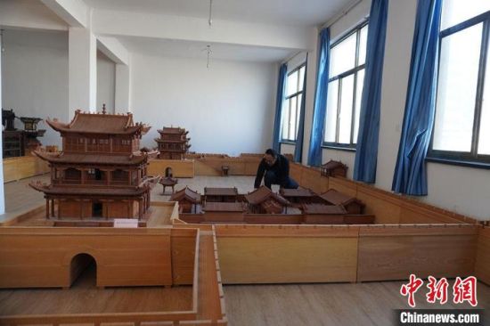 圖為古建筑模型制作技藝傳習(xí)所展廳內(nèi)的微縮古建筑作品?!【琶赖┰? 攝