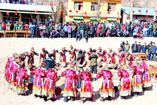 在岷縣,巴當舞只在中寨鎮(zhèn)的古莊村、扎那村牙地社和一路村流傳,尤其古莊村最為鼎盛且具規(guī)模。這里毗鄰卓尼縣藏巴哇鎮(zhèn),藏漢兩地僅一公里之遙,情感相連,民心相通。長期以來,群眾在經(jīng)濟、文化、婚姻等方面交流密切。時至今日,扎那、古莊等村群眾春節(jié)吃肉仍遺留著藏民族彪悍豪爽的風格:一大盤“手把肉”端上來,上面插一把小刀,客人可以自削自啖,這種神秘的文化符號似乎無聲訴說著藏漢兩地的過往、發(fā)展和變遷……