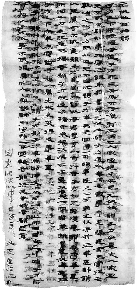 子方足下,善毋恙!苦道子方發(fā),元失候不侍駕,有死罪。丈人、家室、兒子毋恙,元伏地愿子方毋憂。丈人、家室元不敢忽驕,知事在庫,元謹奉教。暑時元伏地愿子方適衣、幸酒食、察事,幸甚!謹?shù)溃簳攺耐投鼗?,乏沓,子方所知也。元不自外,愿子方幸為元買沓一兩,絹韋,長尺二寸;筆五枚,善者,元幸甚。錢請以便屬舍,不敢負。愿子方幸留意,沓欲得其厚、可以步行者。子方知元數(shù)煩擾,難為沓。幸甚幸甚!所因子方進記差次孺者,愿子方發(fā)過次孺舍,求報。次孺不在,見次孺夫人容君求報,幸甚,伏地再拜子方足下!所幸為買沓者,愿以屬先來吏,使得及事,幸甚。元伏地再拜再拜!