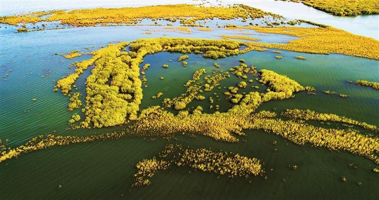 進入10月,位于武威市民勤縣的亞洲最大沙漠水庫——紅崖山水庫群鳥歡鳴,湖水碧藍。水柳倒映之下,猶如一朵朵金黃的秋菊盛開。時值水鳥遷徙,大雁、白鷺、赤麻鴨、大天鵝等水鳥或在空中翱翔,或在湖中覓食,金黃金黃的胡楊樹葉閃爍鋪呈,一層又一層光暈,映照出一幅大漠水庫的金秋勝景。