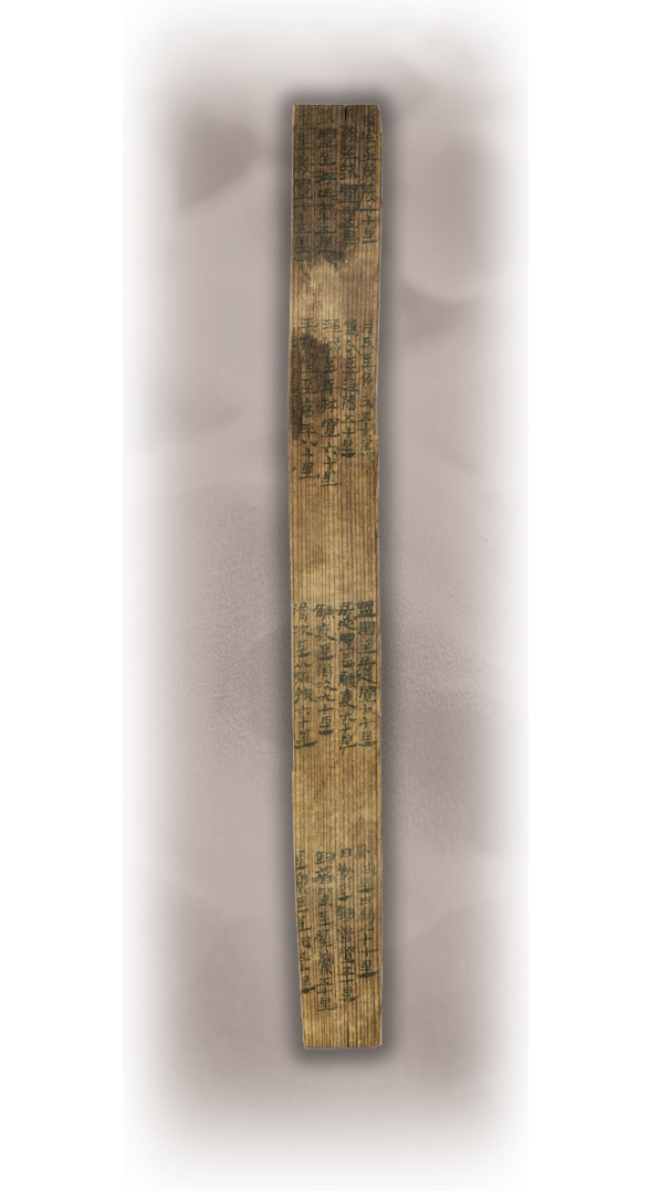 居延里程簡,漢代,國家一級(jí)文物,發(fā)現(xiàn)于1974年,出土于居延破城子遺址。簡為松木制作,長22.9厘米,寬2.1厘米,通簡從上至下分四欄,每欄從右至左分四行(列)抄寫,計(jì)17行,地縣驛置名20個(gè)。