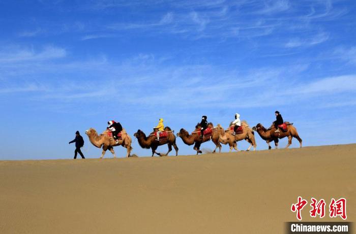 1月27日,游客騎駱駝暢游敦煌鳴沙山。魏佳秀 攝