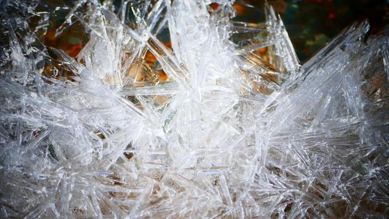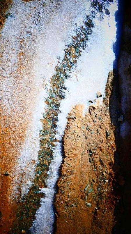 在丹霞山間可見(jiàn)一條冰凍似凍的水溪,系小泉河支流,在陽(yáng)光下透過(guò)像東北冬天窗花一樣的冰花,可看見(jiàn)水下的鵝卵彩石,望遠(yuǎn)看去小溪像一條披上雪衣的彩龍。