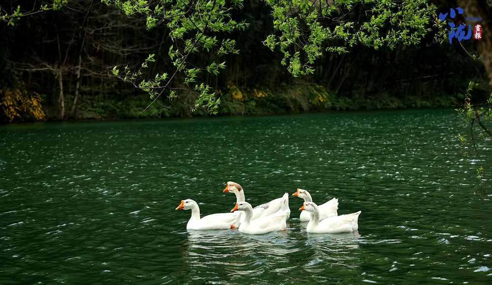 一群群鴨子在清澈的溪水中嬉戲,絡繹不絕的游人無不沉醉在山水之中。