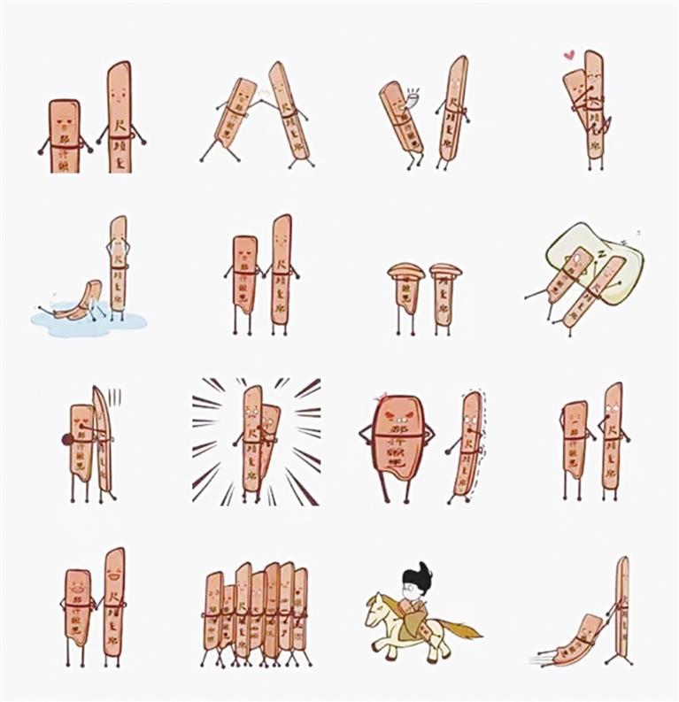 此次上線的簡牘表情包盡可能保留了簡牘原貌,一個個簡牘版簡簡和牘牘表情包長著小短腿和小短手,或擊掌或歡呼或大哭,動態(tài)十足,16組表情包各表其意,在萌趣中體現(xiàn)歷史文化,展現(xiàn)簡牘的魅力。