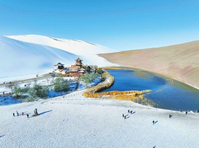 受冷空氣影響,11月14日晚,敦煌市迎來(lái)入冬以來(lái)的首場(chǎng)降雪。雪后的鳴沙山月牙泉景區(qū)銀裝素裹,景色如畫(huà)。游客踏雪而來(lái),拍照打卡,感受大漠里難得一遇的雪后美景。