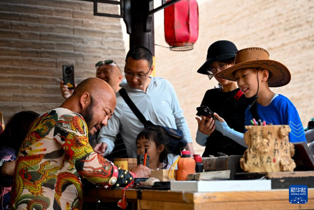 7月13日,在甘肅嘉峪關(guān)關(guān)城景區(qū),李森為游客手寫文創(chuàng)產(chǎn)品“關(guān)照”。新華社記者 劉金海 攝