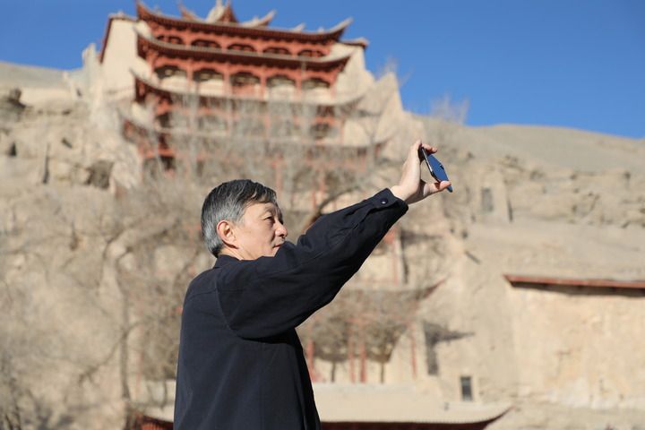 2022年2月23日,敦煌研究院院長(zhǎng)蘇伯民正在用手機(jī)進(jìn)行“數(shù)字敦煌”體驗(yàn)。 新華每日電訊記者 張睿 攝