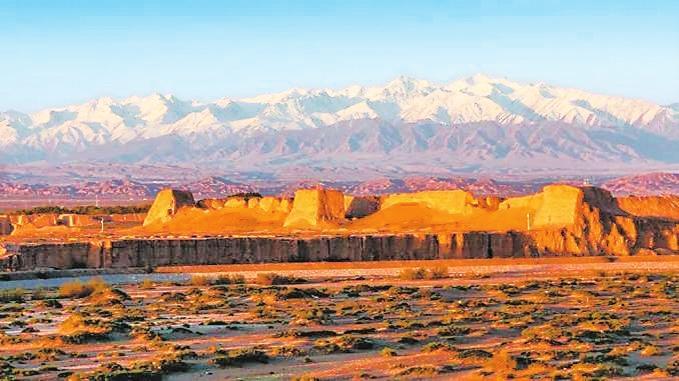 在遠(yuǎn)山映襯的曠野中,一條筆直的公路向祁連山深處延伸,沿途蜿蜒的古長城遺址隨處可見,烽燧關(guān)城遍布高山隘口、河流岸邊、大漠戈壁,形成了獨(dú)特人文歷史景觀,位于遠(yuǎn)處的驪靬古城時(shí)隱時(shí)現(xiàn)。