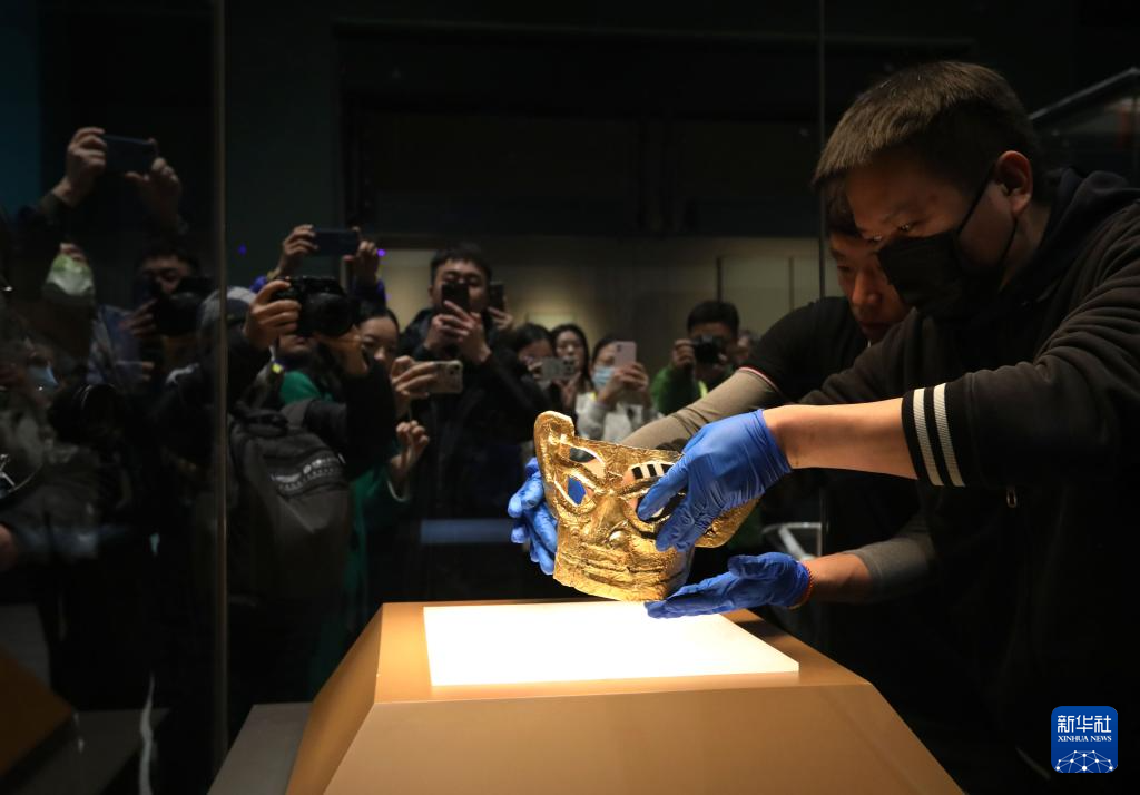 當日,四川廣漢三星堆遺址出土的珍貴文物——金面具和豎披發(fā)青銅人像在上海博物館東館特展廳內(nèi)開箱,移入展柜。坐落于黃浦江東岸的上海博物館東館將于2月2日啟用,開幕展覽“星耀中國:三星堆·金沙古蜀文明展”將對公眾開放。