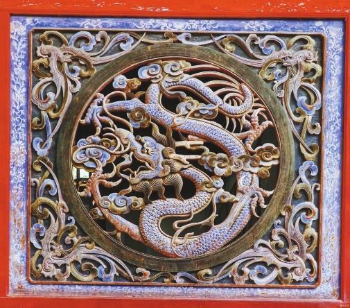 天水伏羲廟位于天水市秦州區(qū)西關伏羲路,是目前我國規(guī)模最宏大、保存最完整的紀念伏羲氏的明代建筑群,1963年被列為甘肅省重點文物保護單位。伏羲廟中有一對龍鳳檻窗木雕,是明代木雕中天水雕刻技法傳世至今的佳作,約有500年歷史。當時匠人將多塊油松木板拼接成方形,再以透雕技法在框內(nèi)圈雕圓形,中刻龜背舞鳳,外飾祥云蝙蝠,龍鳳雀躍,惟妙惟肖,最后用礦物顏料上色點睛。龍鳳檻窗木雕將藝術性和功能性完美統(tǒng)一,承載了諸多文化寓意。有學者認為,這組木雕的圖案既歌頌了伏羲開創(chuàng)中華文明的豐功偉績,又體現(xiàn)了對古文化的一脈傳承。