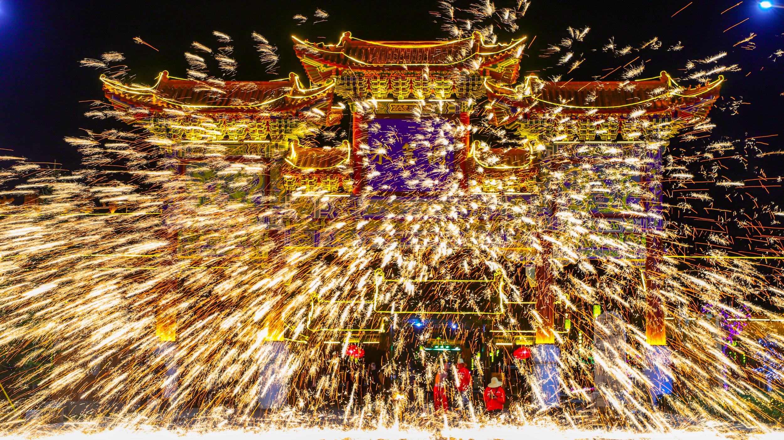 璀璨奪目的鐵花在空中綻放,場(chǎng)面十分壯觀。民眾在火樹(shù)銀花、星光璀璨之間感受著濃濃的中國(guó)傳統(tǒng)民俗文化。
