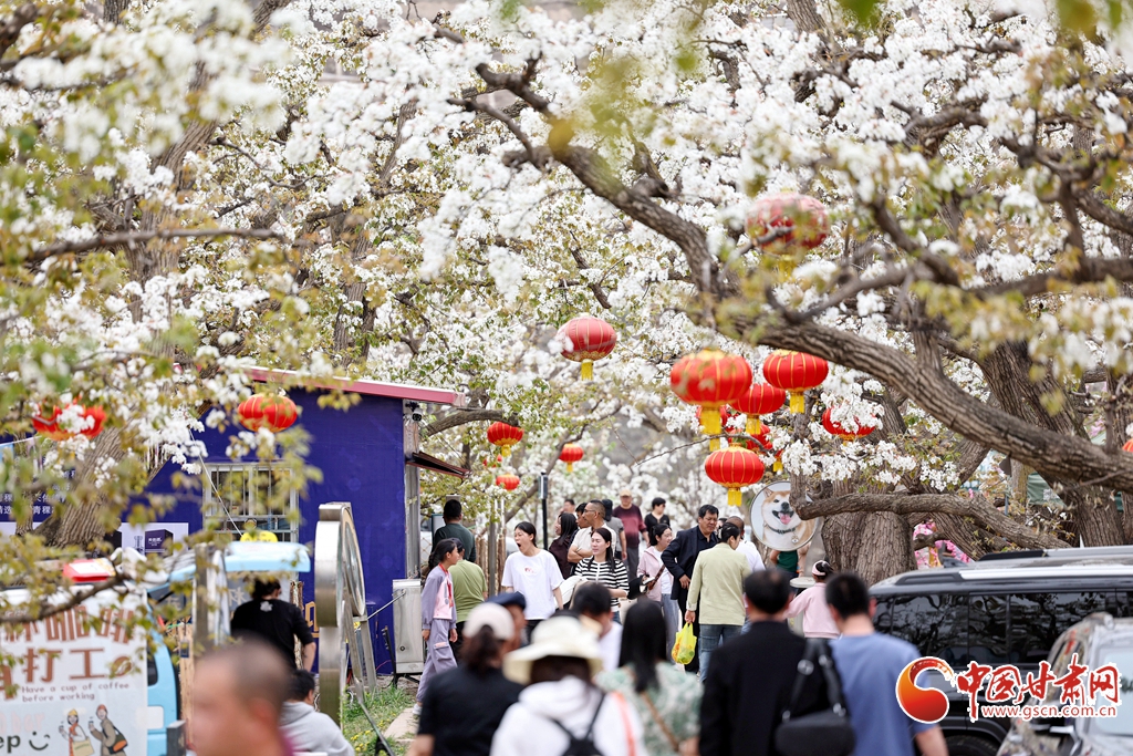 4月13日,位于甘肅省蘭州市皋蘭縣什川鎮(zhèn)的百年梨園綻放如雪,吸引眾多游客前來踏青賞花。