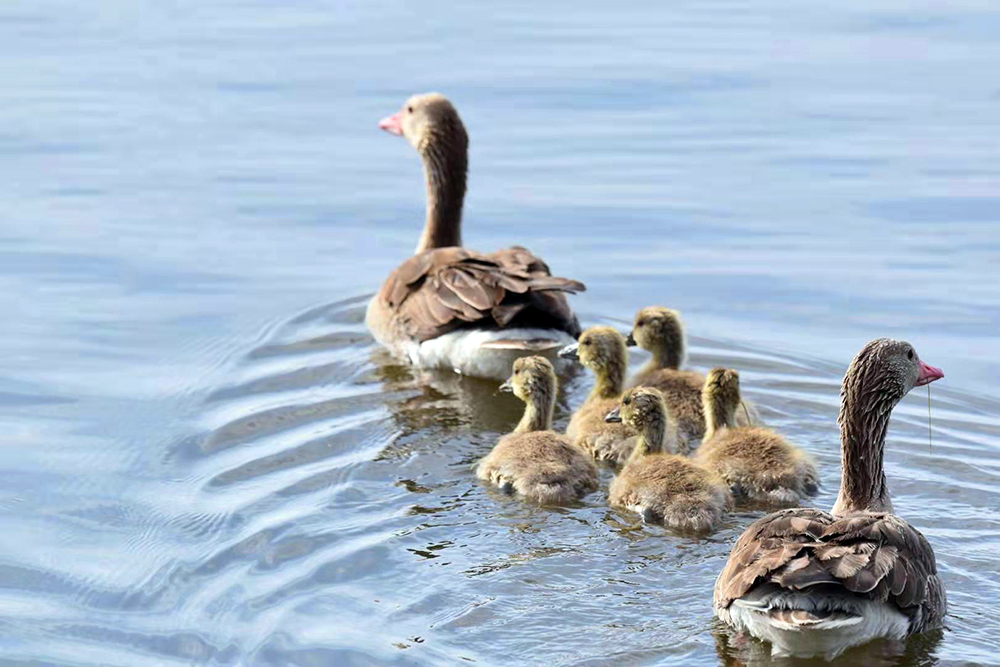 灰雁是鴨科雁屬鳥類,屬國家重點保護的“三有”鳥類,也是陽關(guān)濕地的夏候鳥。監(jiān)測顯示,在陽關(guān)濕地繁殖的灰雁家族有100多只。每年3月下旬遷飛至陽關(guān)濕地,4月中旬筑巢繁殖,5月上旬孵化出雛鳥4至5只。灰雁為“一夫一妻”制,孵化由雌鳥單獨承擔(dān),雄鳥在巢附近負責(zé)警戒。待雛鳥破殼出窩后,則由雌雄共同撫育。灰雁生性膽小、機警,小寶寶溜達時,雌鳥在前開道,雄鳥負責(zé)斷后,小寶寶上岸覓食嫩草芽時,雄鳥仍然負責(zé)警戒,若有危險立刻鳴叫警示。故而,近距離拍攝灰雁雛鳥是比較困難的。
