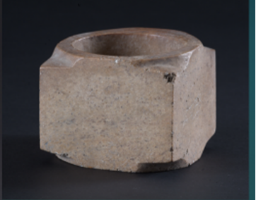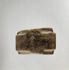 玉琮(編號總0128:1)高4~4.2厘米,外方邊長6.1~6.3厘米,內(nèi)徑5.2厘米,上端射較長,下端射極短,形制原始古樸,切割改制的現(xiàn)象明顯。