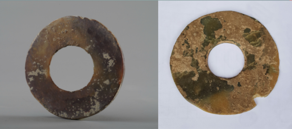胡家底遺址發(fā)現(xiàn)的三對玉璧和玉琮,每對材質(zhì)基本相同,玉璧中孔可套疊在琮之射端,可見當年有可能套疊使用以祭祀天地。