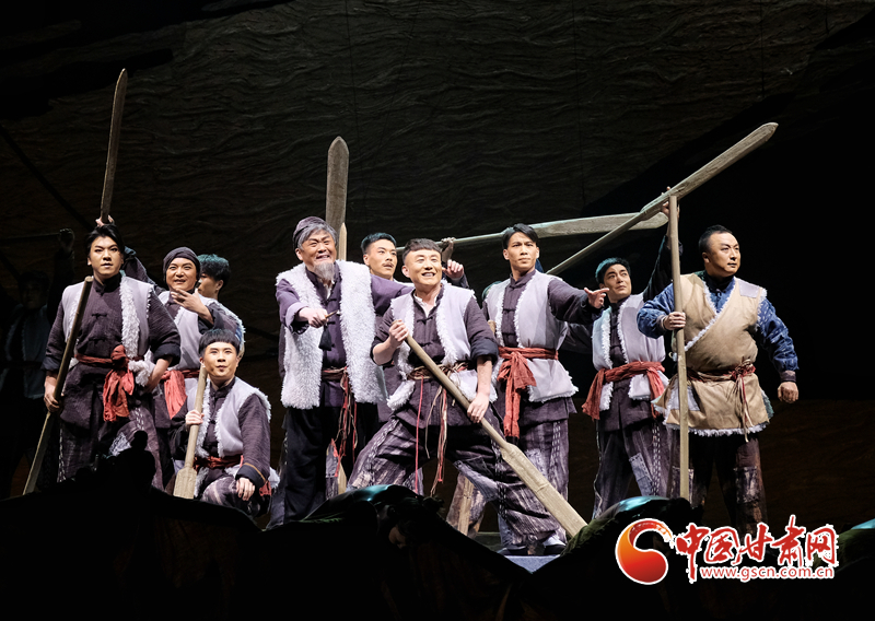 首演當(dāng)晚,一曲黃河特色的“花兒”開場,將觀眾帶回到20世紀(jì)30年代末蘭州筏客子在黃河激流中勇敢拼搏的時代。劇中,筏客子們在經(jīng)歷了碼頭爭奪、蘭州遭受日軍轟炸、金城壯烈犧牲等重重考驗后,在國家危難時刻,舍棄個人恩怨,團結(jié)起來支援抗戰(zhàn),組成水上大型運輸隊,將大量物資安全送達抗戰(zhàn)前線。