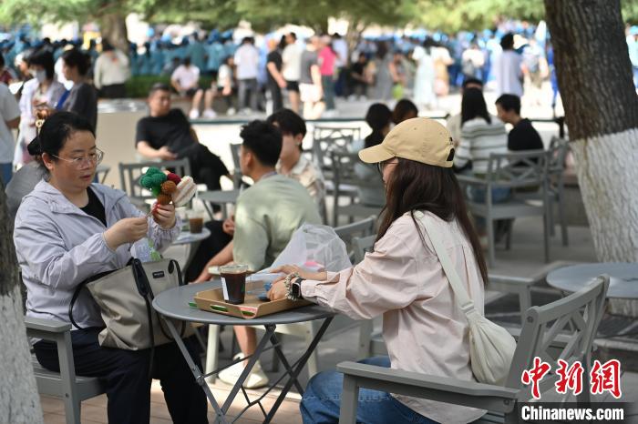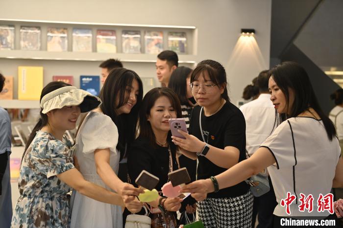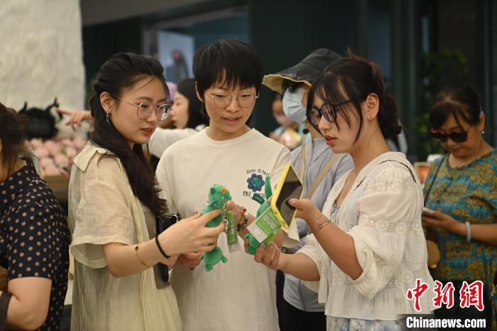 6月19日,甘肅省博物館藝術(shù)生活館在甘肅蘭州開(kāi)館。該館是甘肅省博物館打造的一處復(fù)合型高價(jià)值文化空間,融合了咖啡、烘焙、展覽、藝術(shù)書(shū)店、文創(chuàng)銷(xiāo)售等多樣化業(yè)態(tài)。圖為游客相互交流挑選的綠馬玩偶掛件。中新社記者 李亞龍 攝