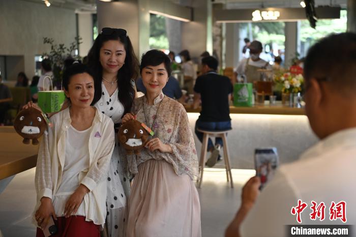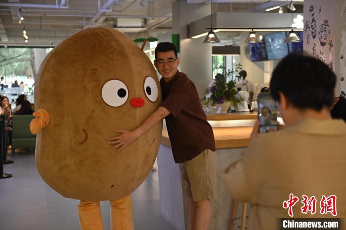 6月19日,甘肅省博物館藝術(shù)生活館在甘肅蘭州開(kāi)館。該館是甘肅省博物館打造的一處復(fù)合型高價(jià)值文化空間,融合了咖啡、烘焙、展覽、藝術(shù)書(shū)店、文創(chuàng)銷(xiāo)售等多樣化業(yè)態(tài)。圖為顧客與蘭州凍梨文創(chuàng)真人玩偶合影。中新社記者 李亞龍 攝