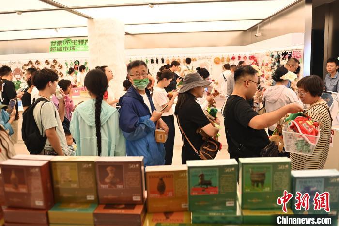 6月19日,甘肅省博物館藝術(shù)生活館在甘肅蘭州開(kāi)館。該館是甘肅省博物館打造的一處復(fù)合型高價(jià)值文化空間,融合了咖啡、烘焙、展覽、藝術(shù)書(shū)店、文創(chuàng)銷(xiāo)售等多樣化業(yè)態(tài)。圖為游客挑選蘭州凍梨文創(chuàng)玩偶。中新社記者 李亞龍 攝
