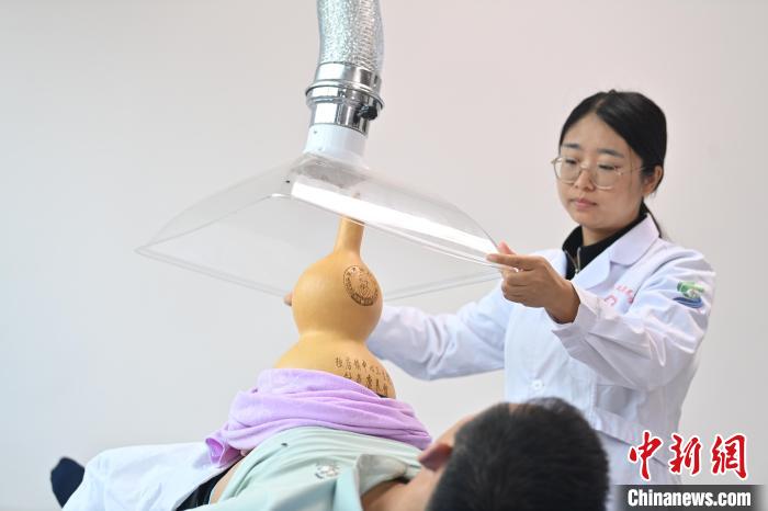 7月16日,甘肅省平?jīng)鍪徐`臺縣皇甫謐針灸康養(yǎng)館內(nèi),工作人員對患者進行葫蘆灸治療。中新社記者 李亞龍 攝