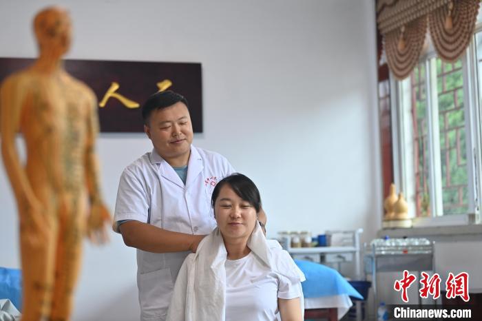 7月16日,甘肅省平?jīng)鍪徐`臺縣皇甫謐針灸康養(yǎng)館內(nèi),工作人員對患者進行推拿治療。2006年,靈臺皇甫謐針灸術(shù)入選第一批甘肅省非物質(zhì)文化遺產(chǎn)名錄。靈臺作為皇甫謐故里,當?shù)孛癖姺浅UJ可中醫(yī)康養(yǎng),針灸、拔火罐、推拿、葫蘆灸、火龍灸(督脈灸)等中醫(yī)特色療法受到了很多人的青睞,當?shù)毓俜揭餐ㄟ^舉辦大型節(jié)會等助推中醫(yī)康養(yǎng)產(chǎn)業(yè)發(fā)展。 皇甫謐是針灸醫(yī)學鼻祖,其《針灸甲乙經(jīng)》已在多個國家被廣泛傳播應用。  中新社記者 李亞龍 攝