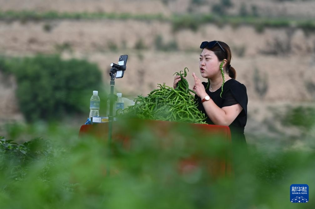 7月22日,在天水市甘谷縣新興鎮(zhèn)侯家溝村的辣椒生產(chǎn)基地,工作人員直播銷(xiāo)售辣椒。新華社記者 范培珅 攝
