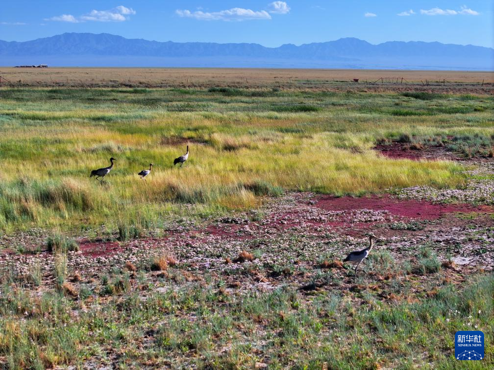 7月30日,黑頸鶴在小蘇干湖濕地覓食(無人機照片)。新華社發(fā)(高宏善 攝)