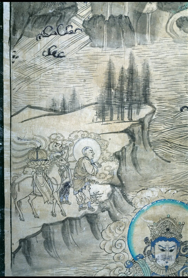 敦煌壁畫中現(xiàn)存六幅唐僧取經(jīng)圖,其中時代最早、保存最完好的一幅繪于西夏時期榆林窟第3窟的《普賢變》中。此幅唐僧取經(jīng)圖似是唐僧師徒在取經(jīng)途中遭遇難關,誠心祈求菩薩協(xié)助渡難。圖中,唐僧身披袈裟,雙手合十,彎腰向前,遙望普賢菩薩參拜。唐僧身后,長相似猴的人雙手合十,抬頭仰望,向普賢致禮,他就是孫悟空的原型——石磐陀。師徒身后有一匹白馬,靜立等待。他們站在懸崖深壑前,面前呈現(xiàn)山窮水盡已無路的困境。