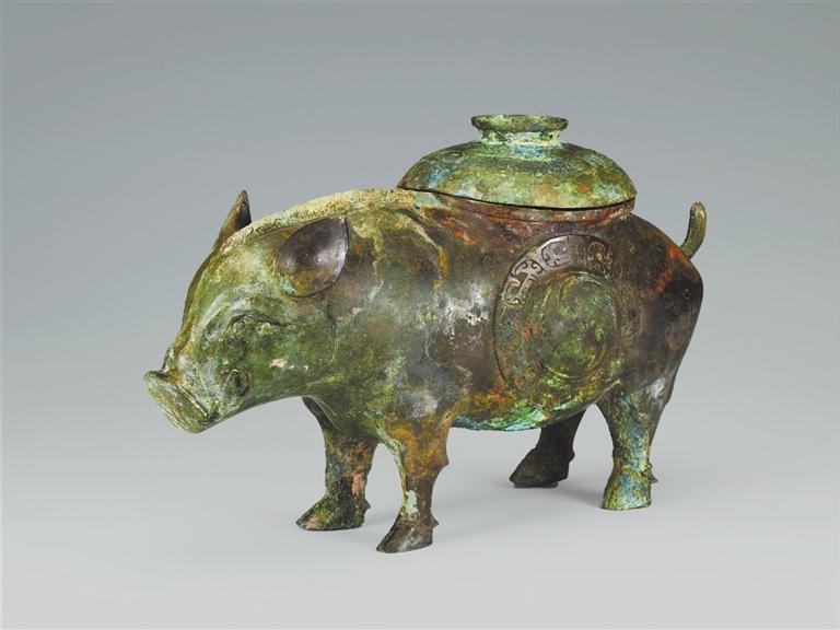 山西省曲沃縣北趙村晉侯墓地113號墓出土。豬尊出土于第一代晉侯燮父的夫人墓中。背上有蓋,蓋面飾云雷紋。器腹兩側(cè)各飾同心圓渦紋,周圍飾變形獸面紋。蓋內(nèi)及外底均有銘文:“晉侯乍(作)旅飤(sì)”。“飤”通“食”,多用于青銅食器上,而此尊應(yīng)是盛酒器,在酒器上自銘為飤,較為罕見。豬是伴隨著農(nóng)業(yè)文明的出現(xiàn)而成為最早飼養(yǎng)的動物之一,先秦時(shí)期多用作祭祀活動的祭牲。晉侯墓地出土的豬尊,將酒器青銅尊鑄成日常生活中豬的形象,造型逼真,憨態(tài)可掬,工藝精湛,充分體現(xiàn)了青銅工匠的聰明才智。