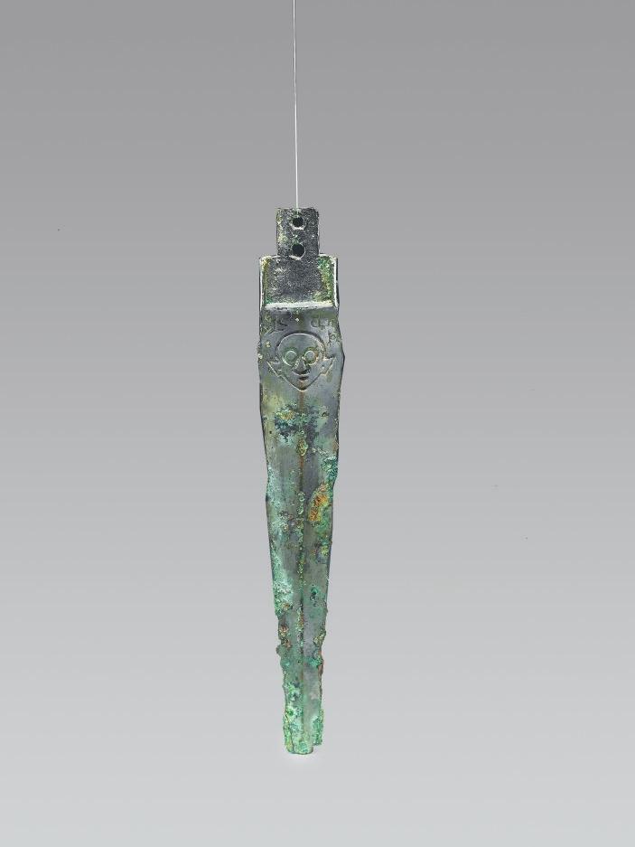 山西省絳縣橫水墓地出土。身呈長條形,中部起脊,兩刃斜直,刃緣鋒利,劍身橫截面呈菱形。莖格部平面呈“凸”字形,有闌,側(cè)闌凸起,橫截面呈“工”字形,后端較窄,有兩個(gè)圓穿。劍身近莖格處兩面均飾陰線人面紋。雙合范鑄造。兩面人面紋頭頂上方鑄銘文:“楚公逆□□中戈。”考古人員推斷,有可能該件器物的作器者為楚公逆,與晉侯墓地M64出土的楚公逆編鐘、宋代嘉魚縣出土的楚公逆鐘的作器者為同一人。