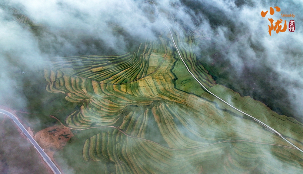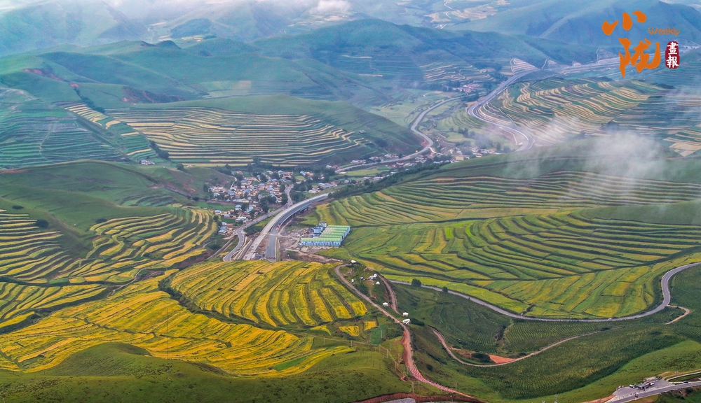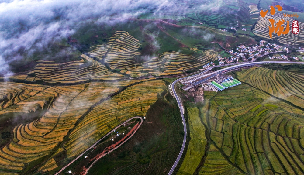 一場(chǎng)秋雨過(guò)后,甘南臨潭連綿的群山被云霧籠罩,星羅棋布的梯田上迎來(lái)收獲期,稻浪滾滾,美不勝收。