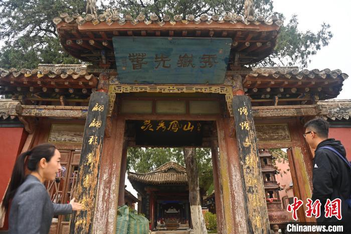 10月23日,甘肅省天水市秦安縣鳳山景區(qū),游人參觀蘇淵雷所題“秀岳先春”的匾額。中新社記者 李亞龍 攝