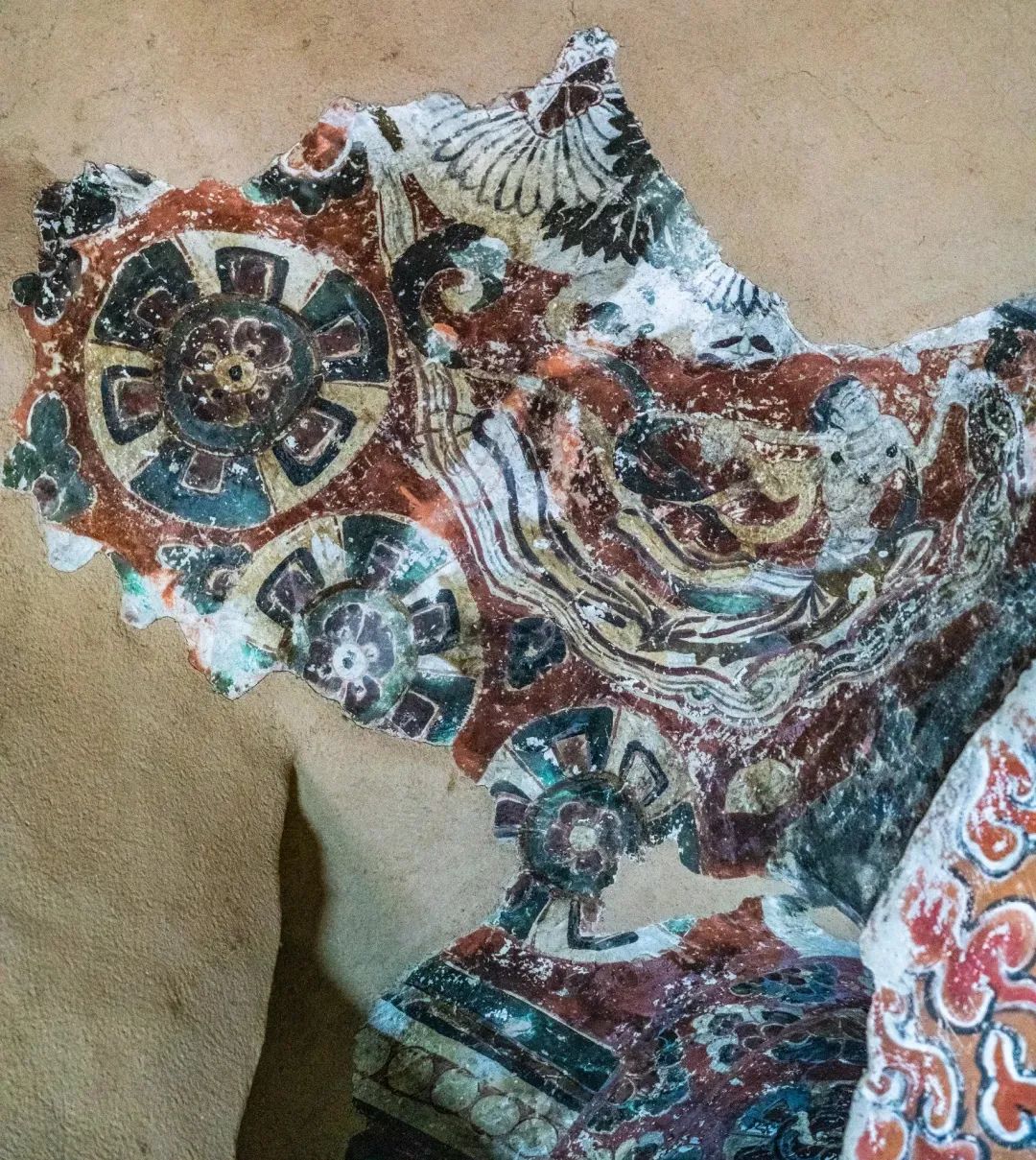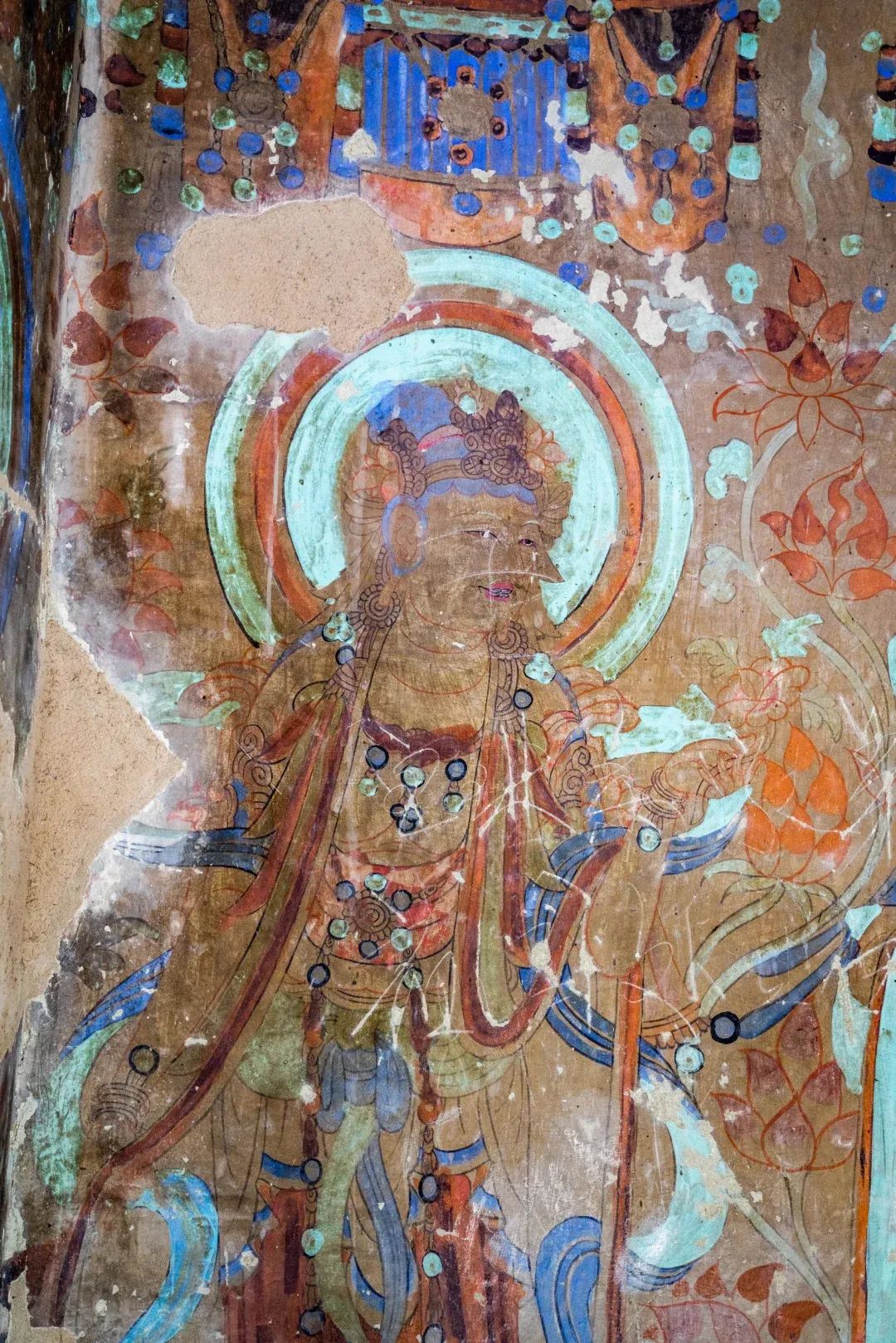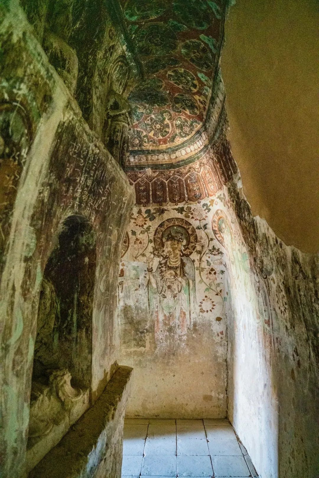 昌馬石窟第4窟洞窟形制及其殘存的塑像對(duì)于研究中國(guó)早期石窟藝術(shù)與佛教造像藝術(shù)極其重要??邇?nèi)壁畫內(nèi)容是四壁上方畫條式旌幡,下畫供養(yǎng)菩薩,身高近2米,今殘存20身,菩薩周圍畫纏枝蓮,與第二窟基本相同。窟頂前半部地仗大部分脫落,靠近中心柱正面上部右側(cè)的部位殘存龜形六瓣團(tuán)花圖案與一身飛天及菊花紋圖案。后部中心柱頂部周圍窟頂表面繪龜形六瓣團(tuán)花、連珠紋等圖案。