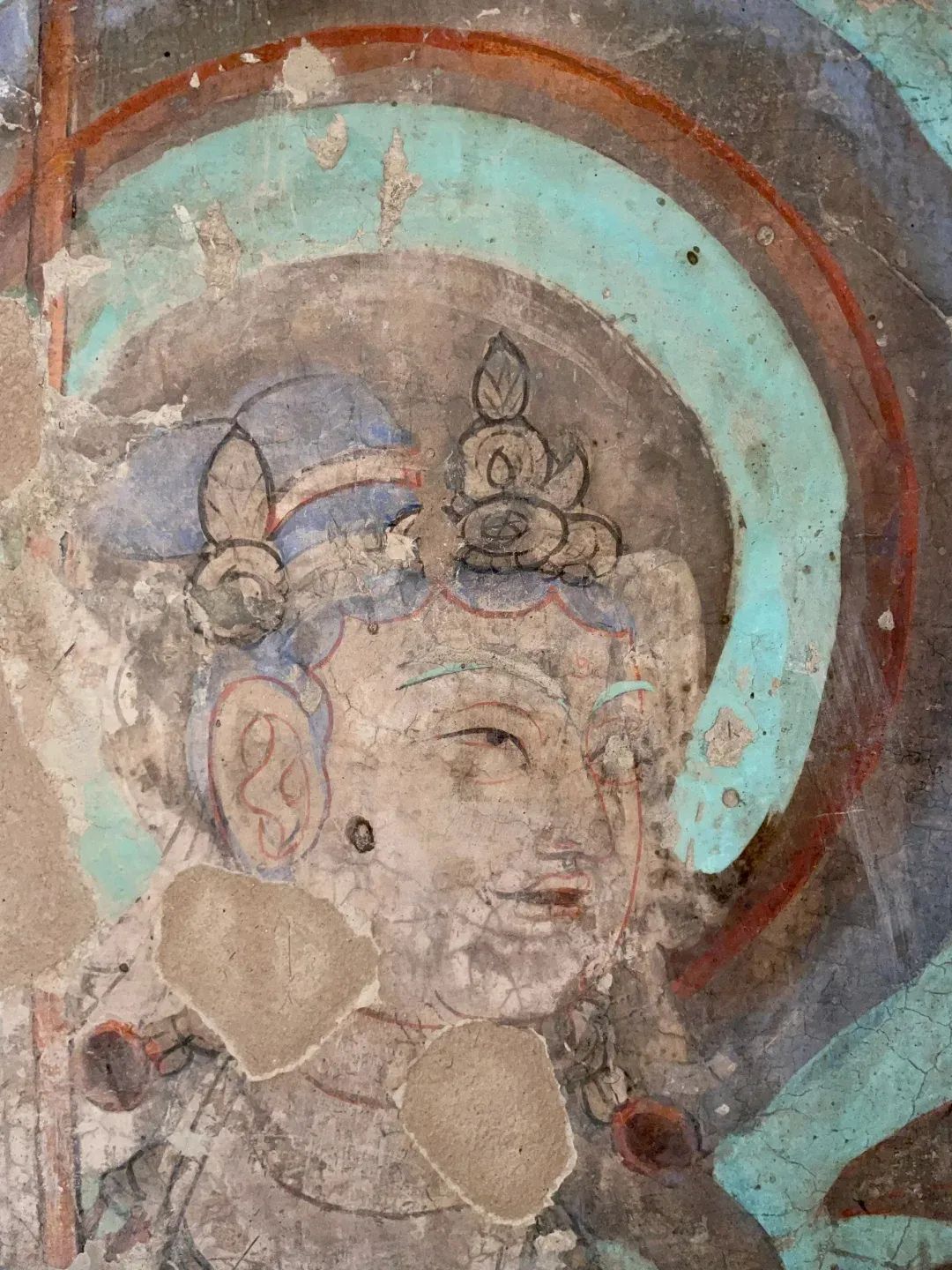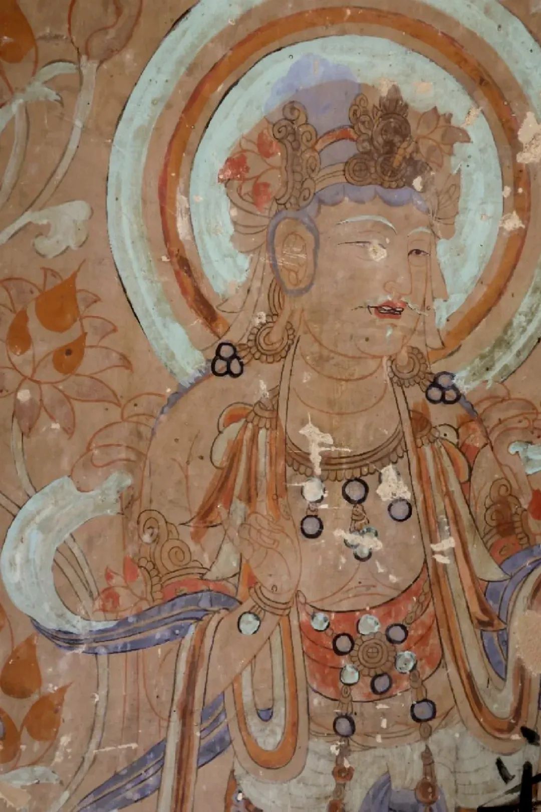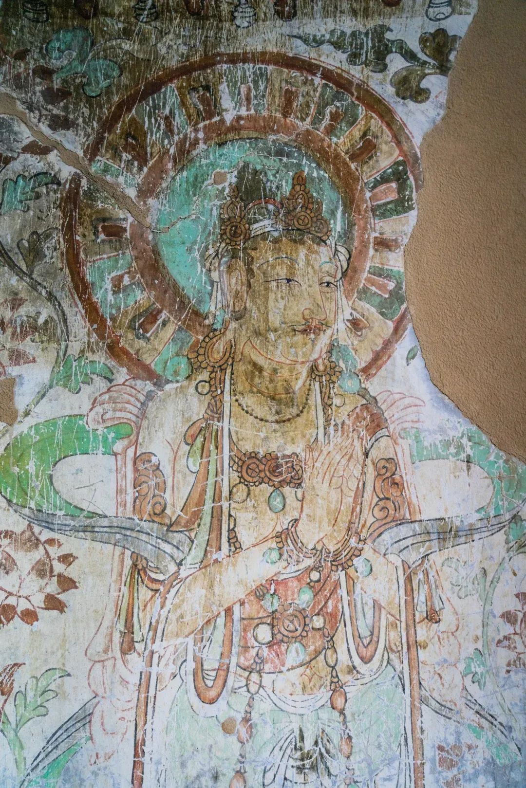 昌馬石窟第4窟洞窟形制及其殘存的塑像對(duì)于研究中國(guó)早期石窟藝術(shù)與佛教造像藝術(shù)極其重要??邇?nèi)壁畫內(nèi)容是四壁上方畫條式旌幡,下畫供養(yǎng)菩薩,身高近2米,今殘存20身,菩薩周圍畫纏枝蓮,與第二窟基本相同。窟頂前半部地仗大部分脫落,靠近中心柱正面上部右側(cè)的部位殘存龜形六瓣團(tuán)花圖案與一身飛天及菊花紋圖案。后部中心柱頂部周圍窟頂表面繪龜形六瓣團(tuán)花、連珠紋等圖案。