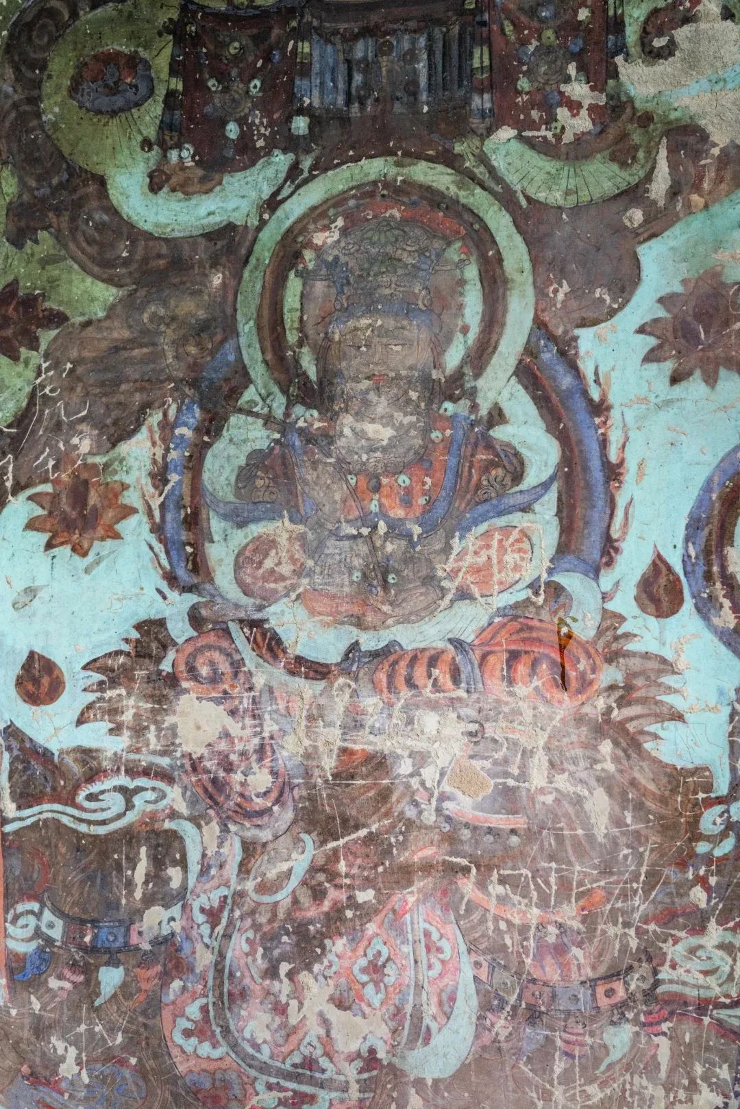 現(xiàn)在第4窟中早期塑像多數(shù)已毀,但仍殘存少數(shù)幾身,十分珍貴;各側(cè)面表層為西夏重修時(shí)繪制的壁畫;柱座與柱身的兩層自下而上逐層縮小;中心柱正面在西夏時(shí)改造成一橢圓形的大背屏,背屏正面表層為清代重繪的壁畫;四壁及頂上壁畫也多為西夏時(shí)期。