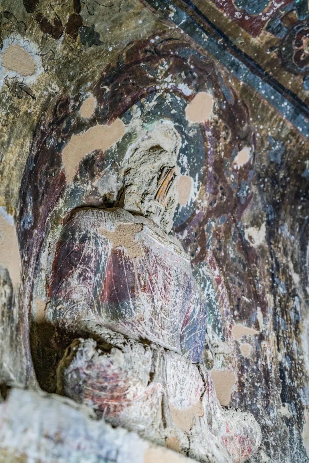 昌馬石窟所在的玉門地區(qū)是古代絲綢之路的必經(jīng)之地,也是佛教?hào)|傳的必經(jīng)之地。早期從印度或西域傳來的佛教造像風(fēng)格在昌馬石窟中也有所反映。第4窟中心柱上層的坐佛塑像采用的在胸前及手臂表面呈連續(xù)相疊的“U”字形下垂的陰線刻衣紋的形式,我們?cè)诙鼗湍呖叩?59窟與馬蹄寺石窟千佛洞第2窟等處的坐佛塑像身上都可以見到,這種貼體的袈裟表面陰刻規(guī)整衣紋的形式是受到印度笈多造像藝術(shù)影響的產(chǎn)物。