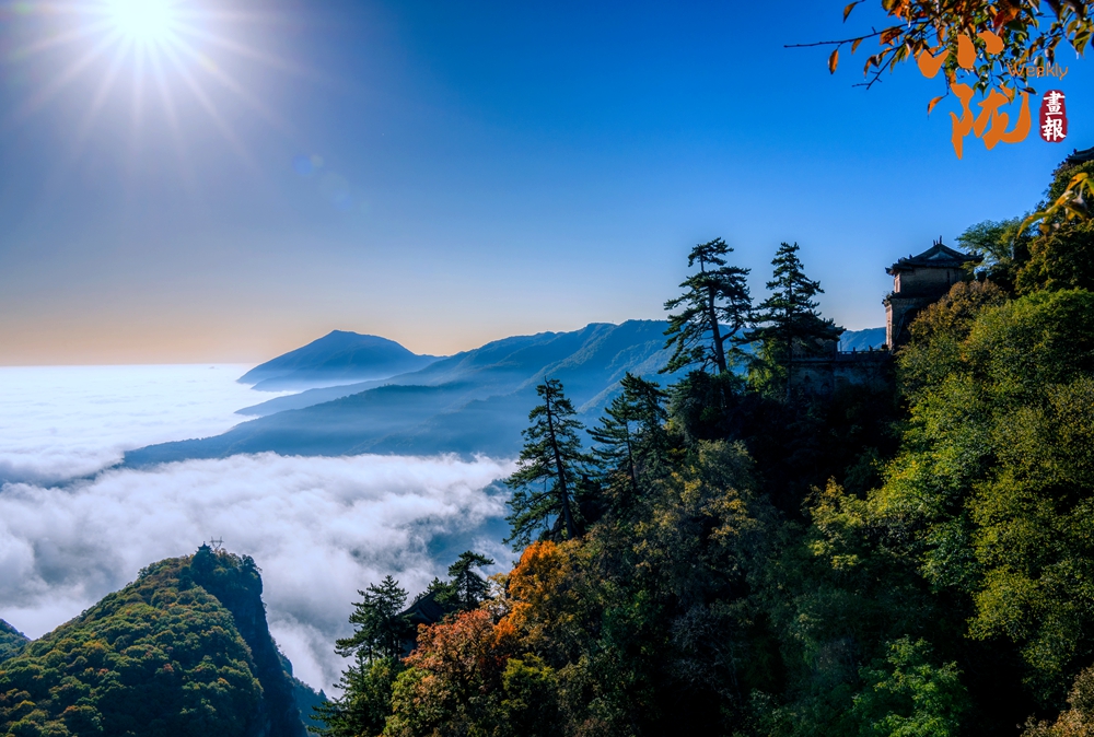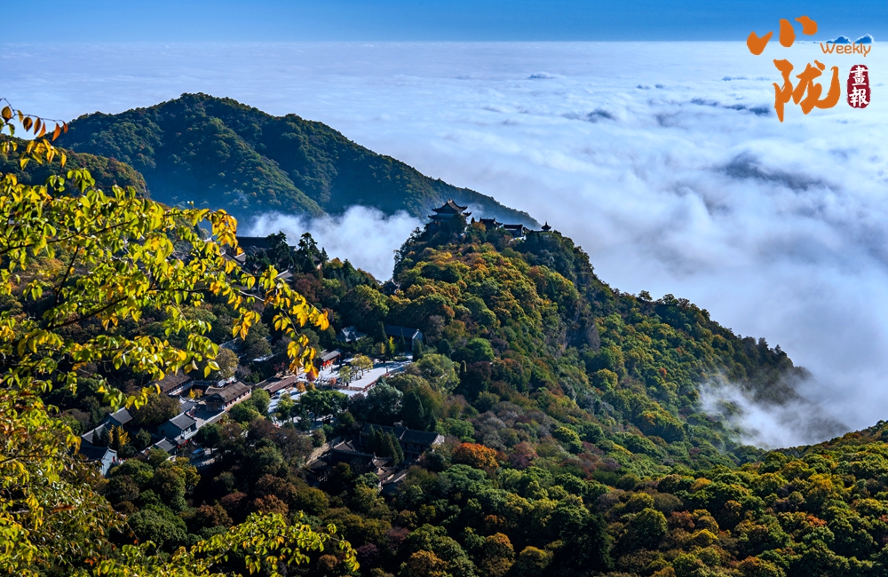 云霧繚繞,金黃的葉子似金色海洋,覆蓋山脈,在陽光照耀下散發(fā)著溫暖光芒,仿佛為崆峒山披上了璀璨外衣。