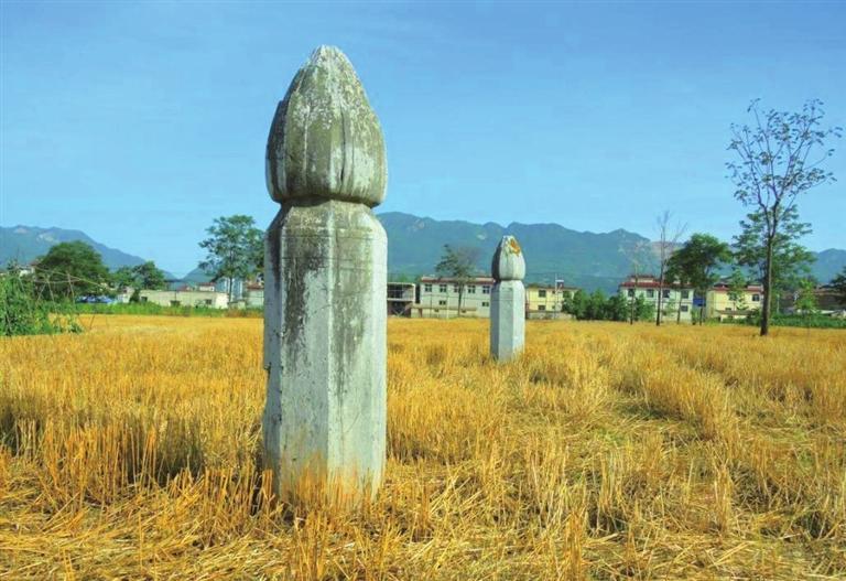 平闊的川地,村人已把一地莊稼收入自己殷實(shí)的谷倉,田野涂遍了陽光的顏色。遠(yuǎn)遠(yuǎn)地,我們就看見一座有兩尊八楞蓮苞頭華表矗立在田野之間,在另一塊地里,還有一個(gè)僅裸露肩膀于地表、頭顱已缺失的石翁仲,圓領(lǐng)官服、胸垂綬帶的文官裝束隱約可見……