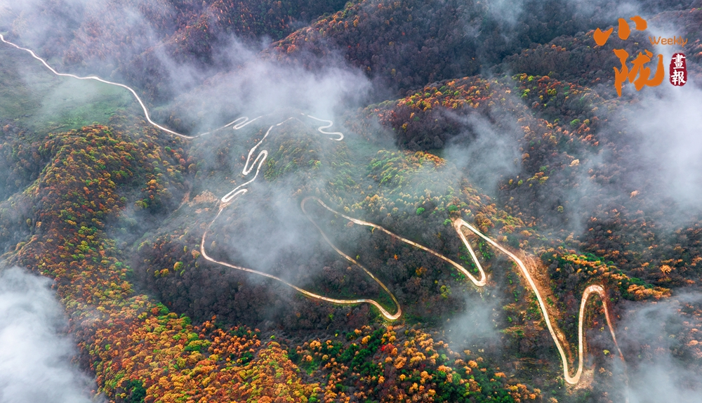 山巒起伏,彩林密集,鋪滿整座山谷。山巔公路宛若玉帶鋪成開來,橫貫蒼茫的林海之上,直通天際。