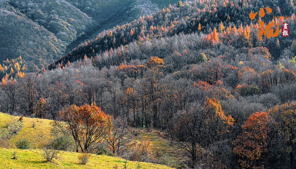 初冬時(shí)節(jié),華亭關(guān)山的楓葉漸漸褪去翠綠,染上了濃濃的金色,一幅色彩斑斕的美景。