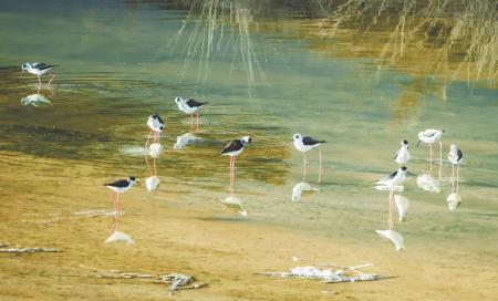 4月9日,一群黑翅長(zhǎng)腳鷸在定西湖水面飛行。進(jìn)入4月,候鳥陸續(xù)北遷,定西湖成了眾多鳥群遷徙途中的歇腳補(bǔ)給地。新定西·定西日?qǐng)?bào)記者 牛小棟 攝